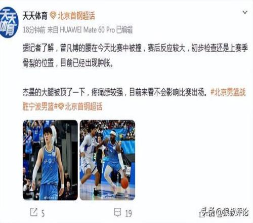 根据北京媒体《天天体育》的报道,曾凡博的腰在今天比赛中被撞,赛后反应较大,初步检查还是上赛季骨裂的位置,目前已经出现肿胀。